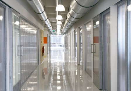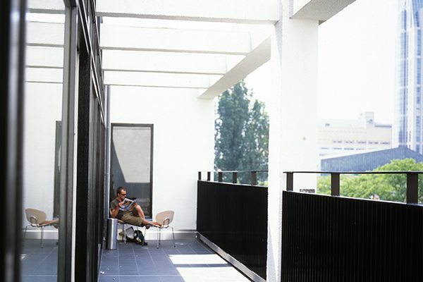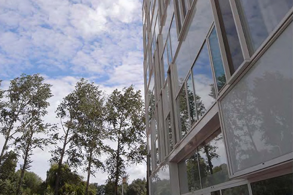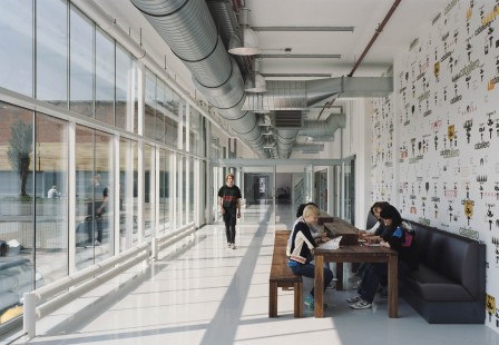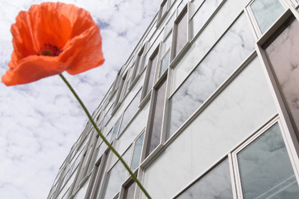 The new screen facade has been put in front of the existing pillar structure, without attachment, thus allowing for the original structure to remain visible, while a new vertical layer has been added.By inserting coloured glass into the facade, part of which can also be opened, an internal climate is created, which changes throughout the day.