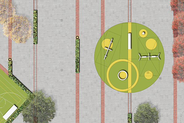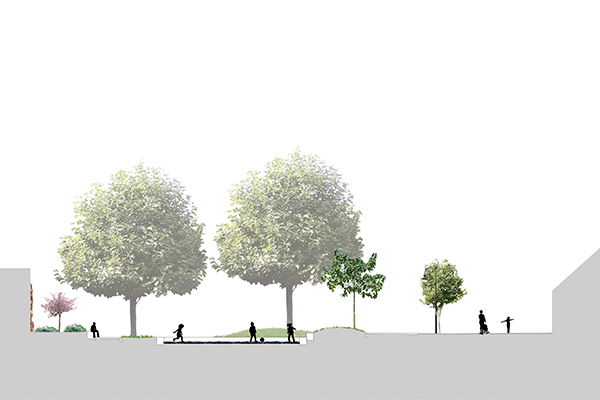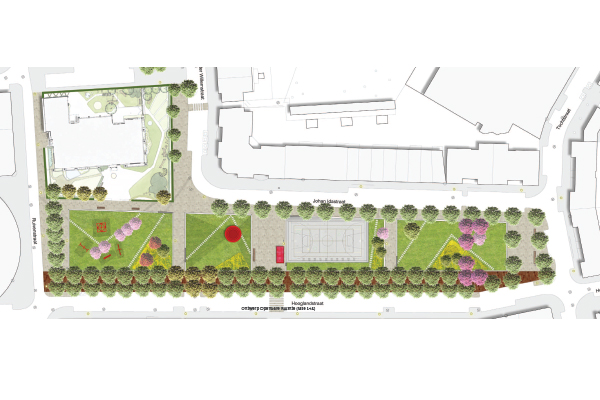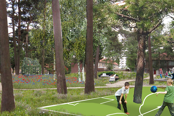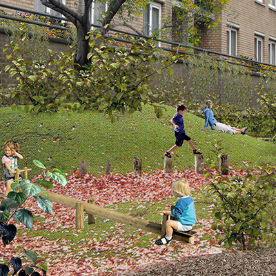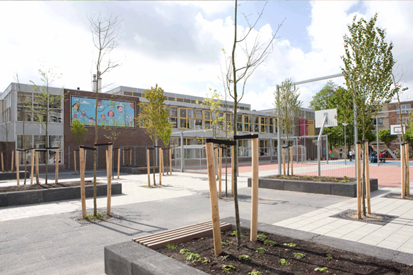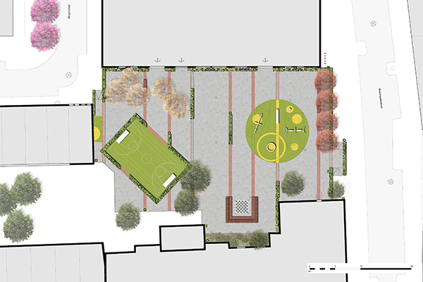 'I dream of a green square', is what the children said, and with that in mind the dilapidated playground has been transformed into a square full of hedges and trees.