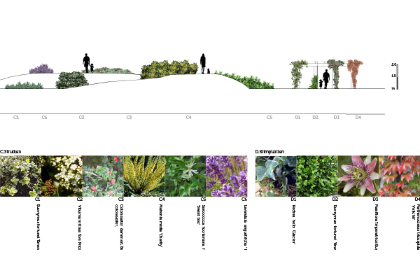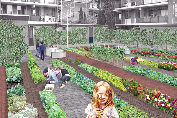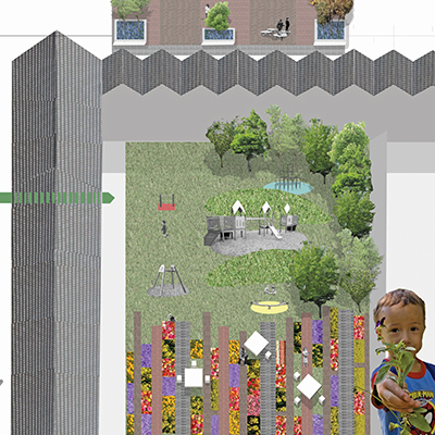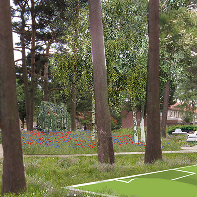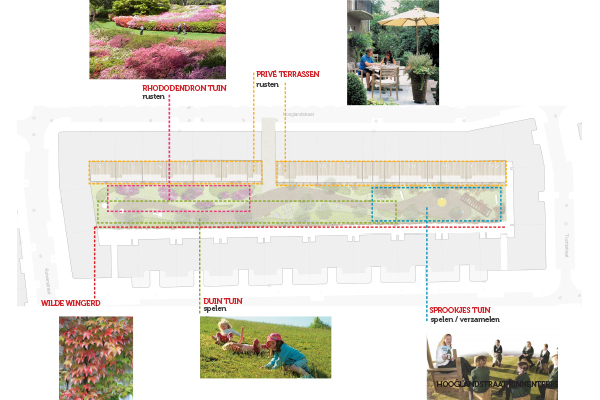 The landscape hosts various areas for playing, meeting and gardening. A circular route connects the different areas. Children can come and play and do sports. A walking trail allows you to explore the entire landscape and meet other residents.