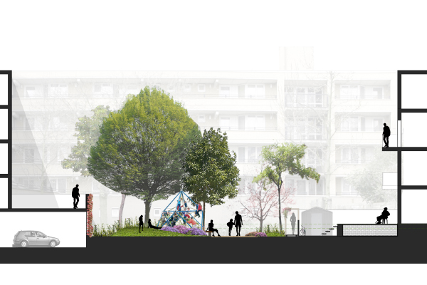To increase the quality of the interior courtyard for all residents, the proposition was to vastly increase the amount of greenery contained within it. Parking was transferred to outside the built-up area.