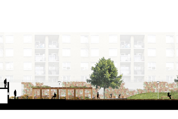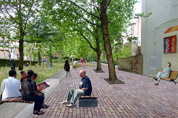 With the aim to implement more greenery the Borough council redeveloped the square in collaboration with local residents. This includes spaces to linger, play and for active gardening.