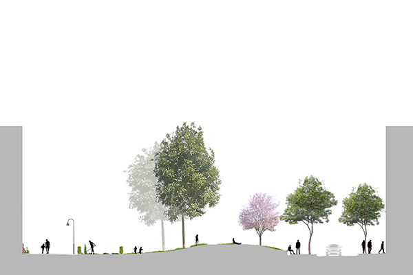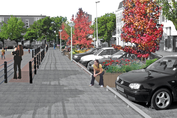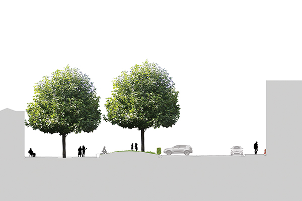 The design comprises the rearrangement of a 500-metre-long street. Part of the parking spaces would be removed, the maximum speed would be reduced, while trees would be added, and play areas integrated at regular intervals.