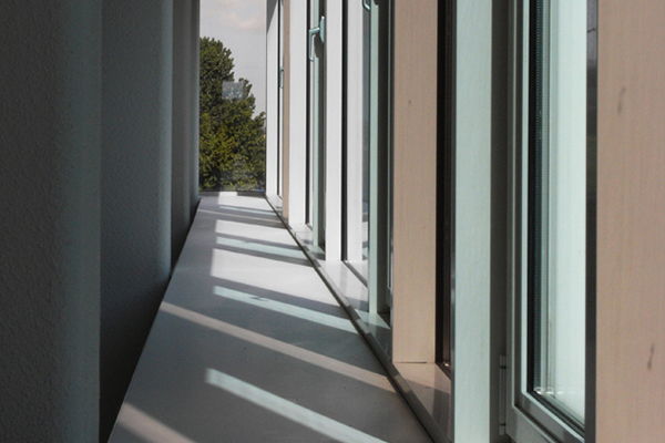 The construction of the post-war monument was borne in mind. Large sliding doors ensure that the transition between inside and outside remains as transparent as possible.