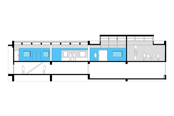 The canteen can be used in a flexible way. The flexibility is made possible by the large blue cupboard, which contains all functions, such as exhibition, lighting, ventilation and space dividers.