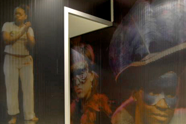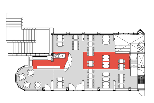 Which is why the main, simple intervention has been made in the central zone. The zone is demarcated by red carpet that covers the walls, floor and ceiling. Around this element everything in the pavilion has been organised. Connected to it one finds the buffet, the staircase and the vide.
