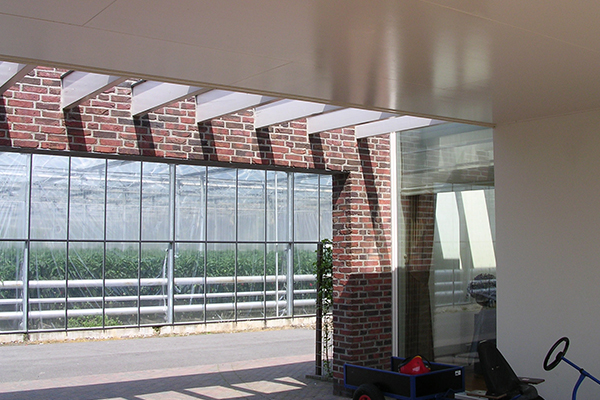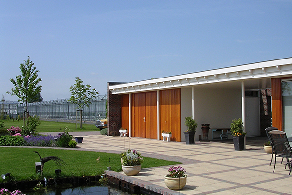 Part of the greenhouses was torn down. To demarcate the plot, two brick walls were added, against which an extension of a house, two garages and a carport were positioned.