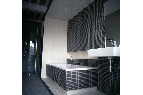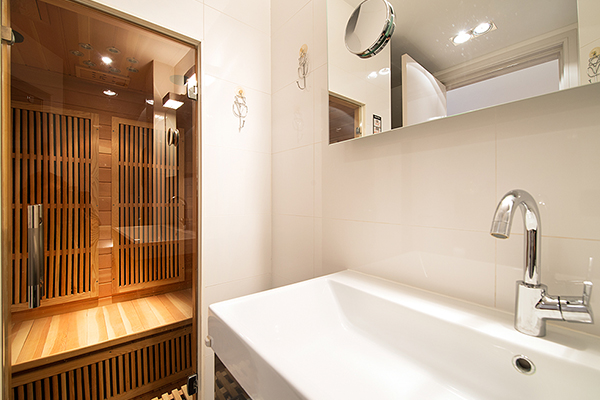 The new bathroom on the first floor consists of a wooden box made out of tarred boat timber. The bathing facilities are located within