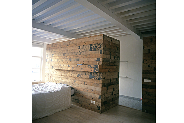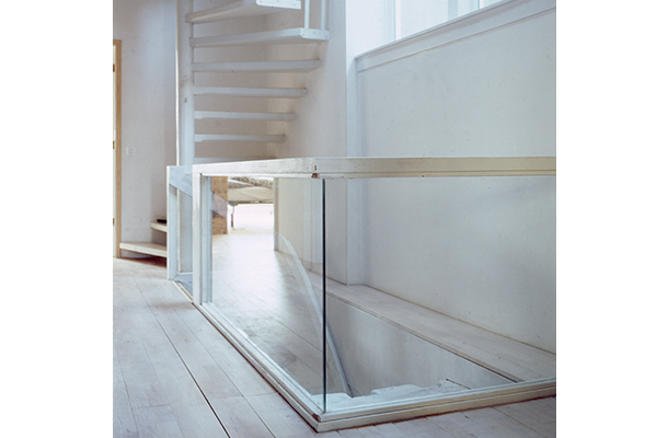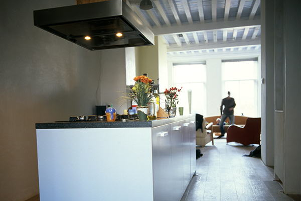 The facade on the first floor has a large window that looks out onto an alley. The dimensions of this window were extended to the skylight that was added to the roof. The stairs were positioned in relation to the skylight and the vide has been extended towards the second floor. As a result a lot of daylight now also reaches the ground floor, including the kitchen and the library.