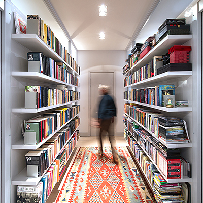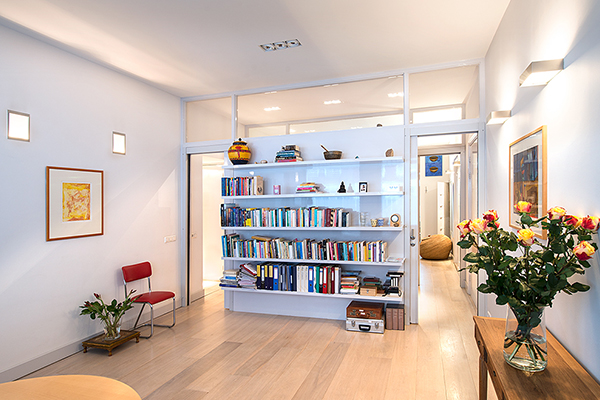 Therefore these spaces have now become organically connected with the other living spaces. To retain some privacy, large cupboards have been positioned between the original corridor and the kitchen and the library.