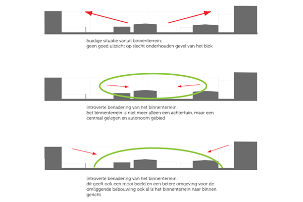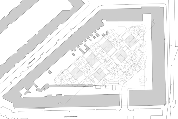 Located in an area that has many 'hofjes' [almshouses], a new 'hof' was designed around the preservation of existing trees. The houses would be oriented towards the inner courtyard, which would also house the communal building.